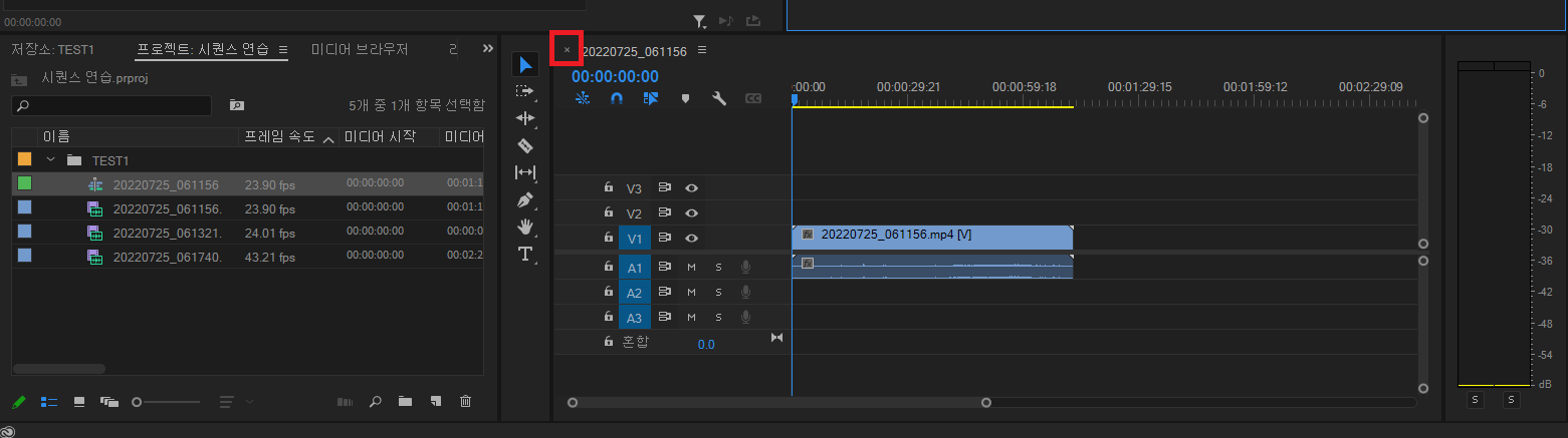 빨간 색 네모 안에 x 표시를 눌러주면 활성화된 시퀀스 파일이 닫힙니다. 그리고 나서 또 다른 파일을 드래그 하면 두 번째 시퀀스 파일을 만들 수 있습니다.