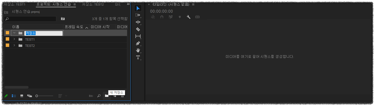 아래 그림과 같이 프리미어 프로에는 새 저장소 기능이 있습니다. 윈도우로 치면 새 폴더 기능이죠. 여기에 우리가 편집해야 할 여러가지 영상 파일들을 분류하여 담아놓을 수 있죠.