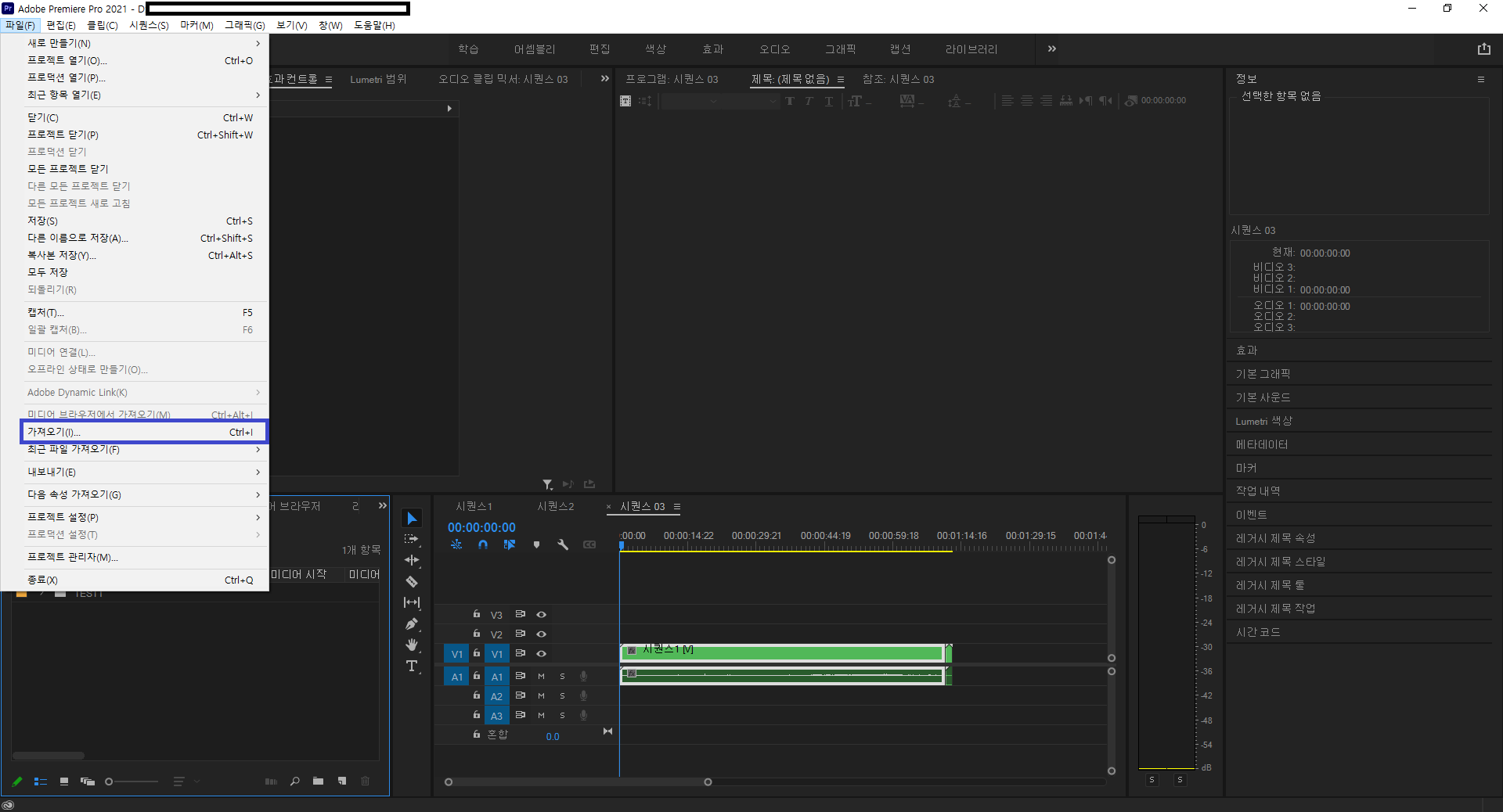 두 번째 시퀀스 파일을 만든 모습입니다. 이 시퀀스 파일들로 새로운 상위 시퀀스 파일을 만들 수 있습니다. 현재 활성화된 시퀀스 파일을 우선 닫고...