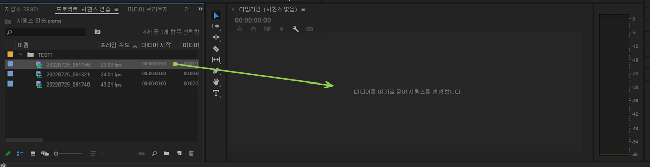 이제 편집할 파일을 집어 타임라인으로 드래그 해줍니다. 그러면 두 번째 사진처럼 시퀀스 파일이 자동 생성되죠. 또 다른 파일을 드래그 해서 붙여도 시퀀스 파일은 그대로입니다.