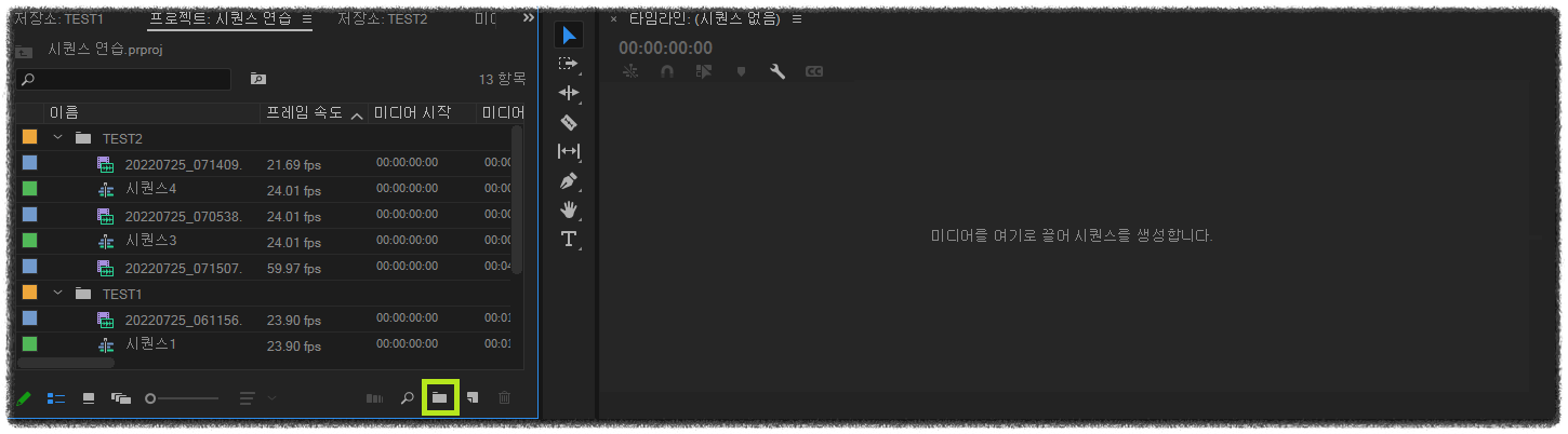 헷갈리지 않게 이름도 바꿔줍니다. (참고로 폴더와 시퀀스 파일, 영상 파일 등은 이름 부분에 마우스를 대고 더블 클릭하면 이름을 바꿀 수 있습니다.)