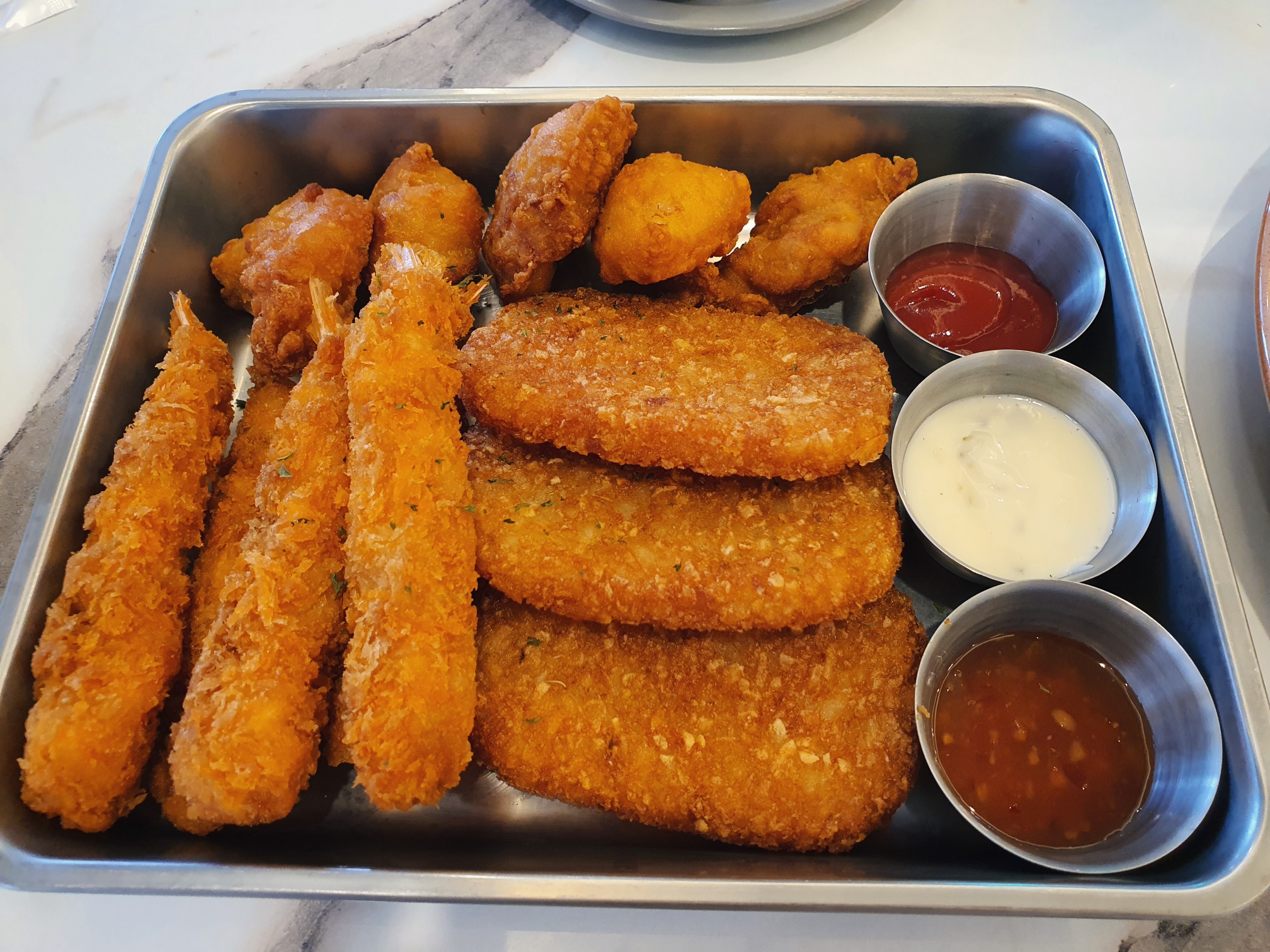 치킨 가라아게는 쏘쏘~~했는데 해쉬브라운이랑 새우튀김은 넘 맛있었다. 역시 튀김은 갓 튀겨서 나왔을 때가 제일 맛있다.^^ 근데 먹다보니 속이 느끼해져서ㅠ마지막엔 매콤달콤한 칠리 소스만 계속 찍어 먹었다.